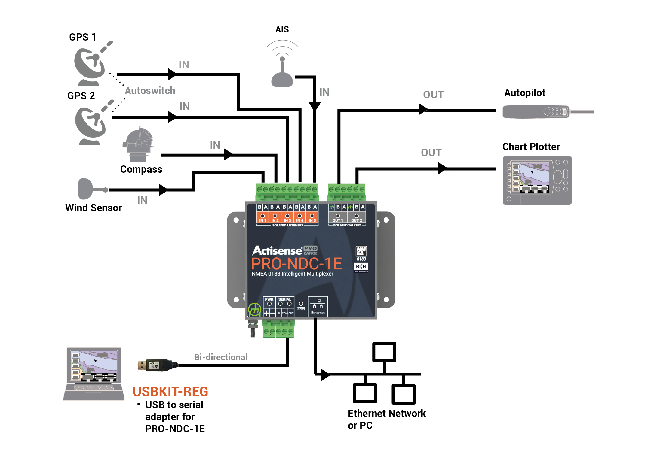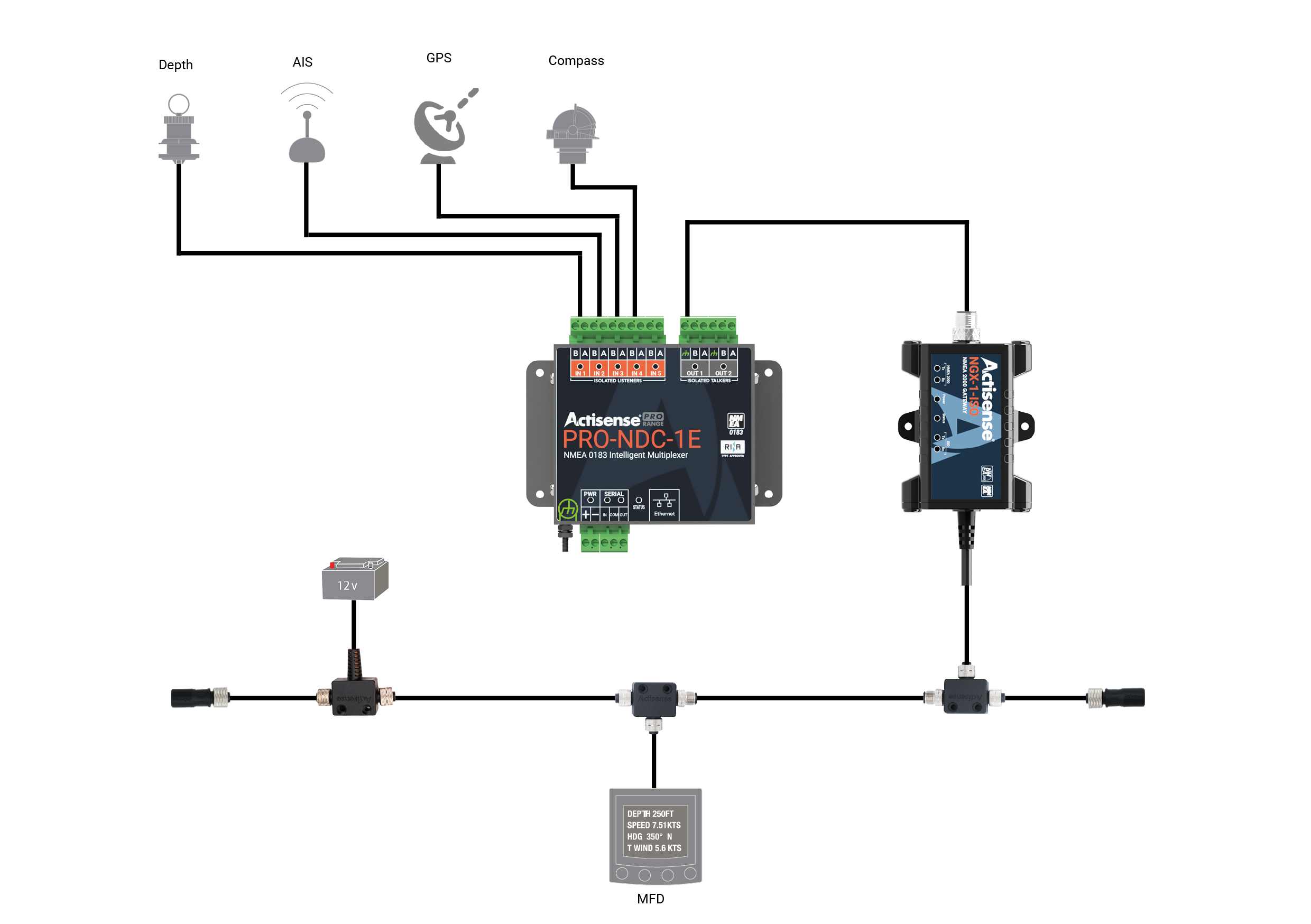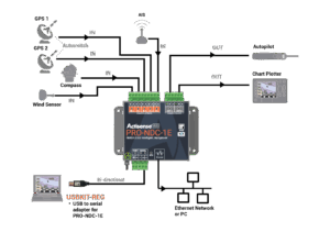 An example of this could be on a commercial vessel with multiple NMEA 0183 GPS, wind, AIS and depth instruments. To get all of this data combined and sent to a display or converted via an NGX to NMEA 2000, a PRO-NDC-1E can be used.